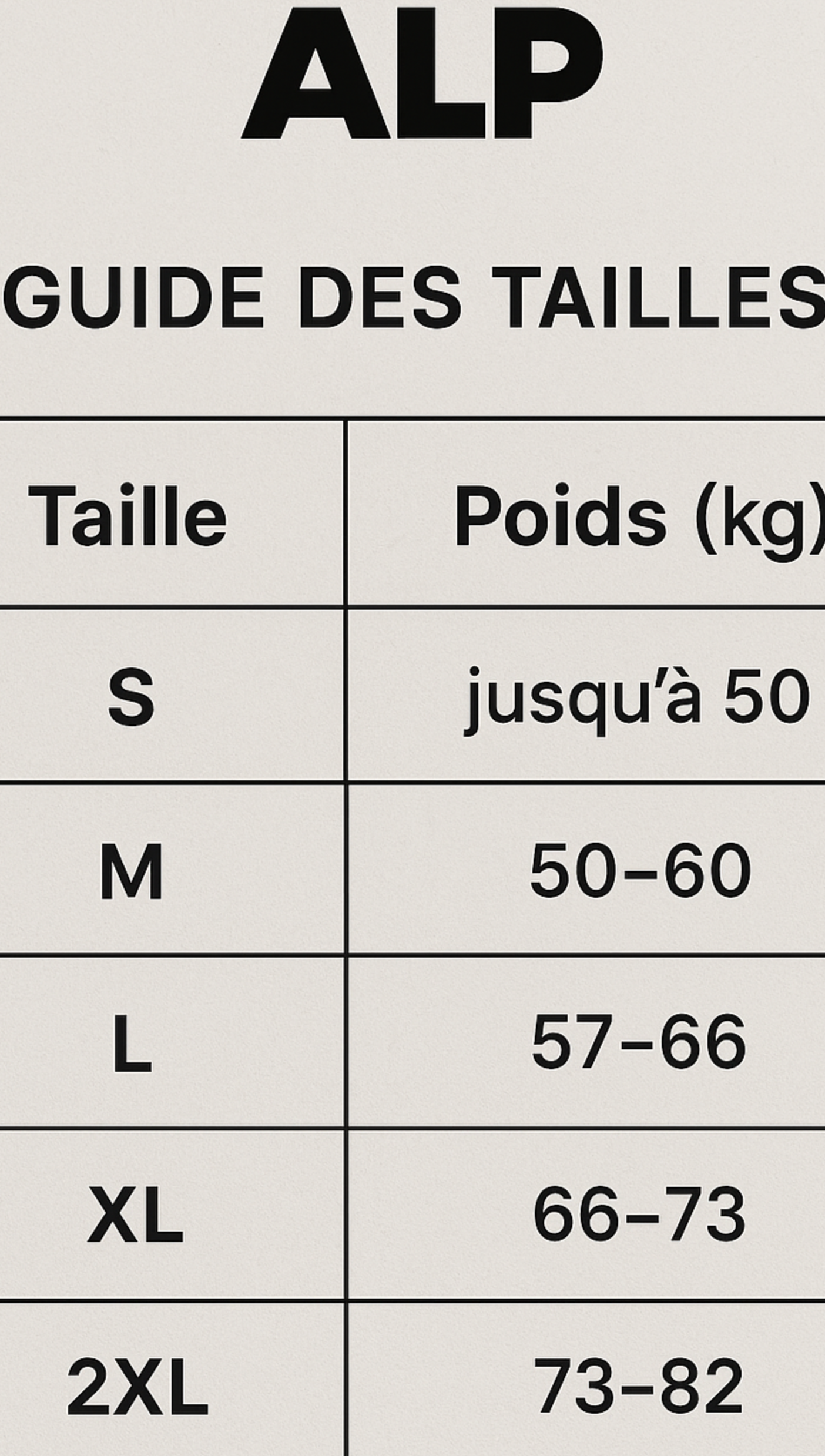 +Référez-vous à notre guide des tailles basé sur le poids pour trouver l’ajustement idéal. En cas d’hésitation entre deux tailles, choisissez la plus grande pour un confort optimal.